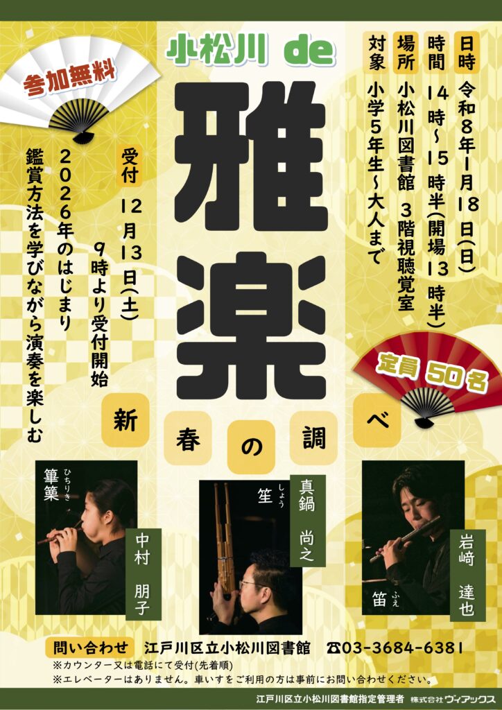 カレンダー カレンダーに追加 Timely カレンダーに追加 Google に追加 Outlook に追加 Apple カレンダーに追加 他のカレンダーに追加 XML ファイルとしてエクスポート 日時: 2026-01-18 @ 14:00 – 15:302026-01-18T14:00:00+09:002026-01-18T15:30:00+09:00場所: 小松川図書館 〒132-0035 東京都江戸川区平井1丁目11−26参加費: 無料 ワークショップ 雅楽 ← 伝統と革新3 〜古典を紐解き、未来の伝統を創造する〜 雅楽饗宴 →コメントを残す コメントをキャンセルメールアドレスが公開されることはありません。 * が付いている欄は必須項目ですコメント名前 * メール * サイト 上に表示された文字を入力してください。 このサイトはスパムを低減するために Akismet を使っています。コメントデータの処理方法の詳細はこちらをご覧ください。